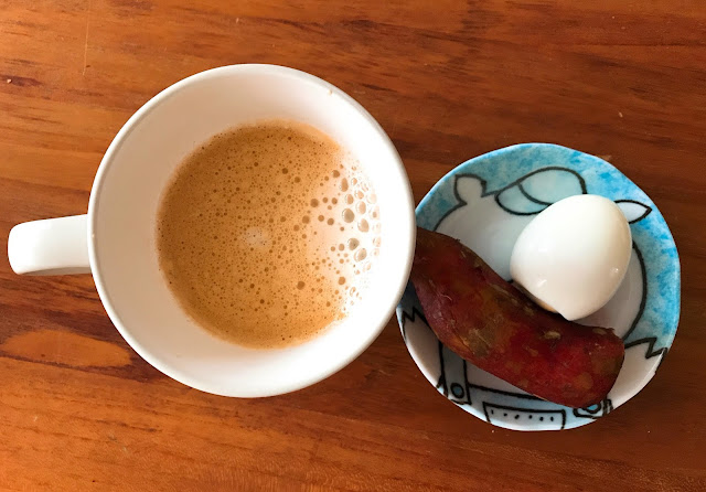 早餐--蒸地瓜、水煮蛋、黑咖啡